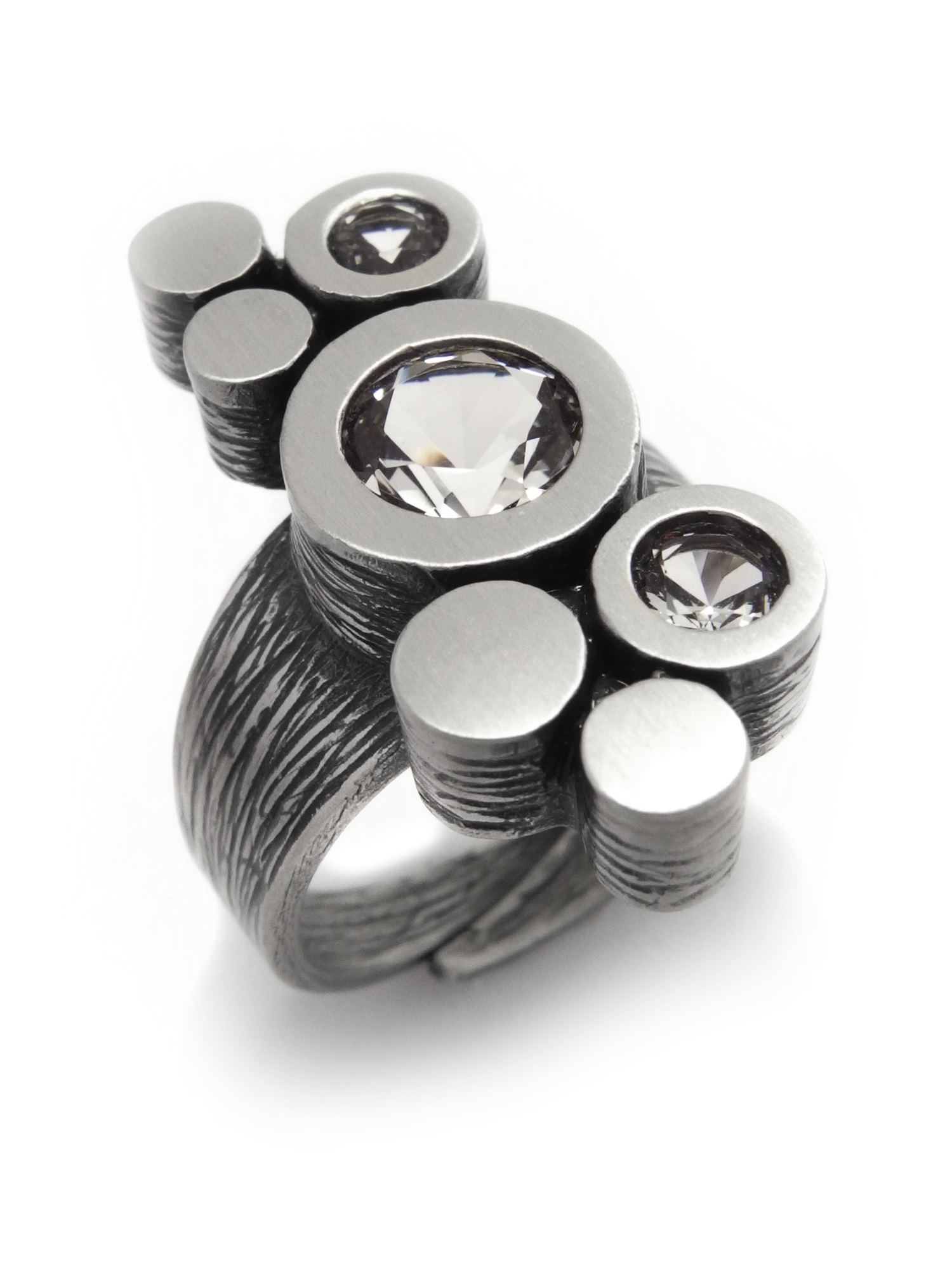 Minimalistisch gearbeiteter Damenring aus teilweise geschwärztem, gebürstetem und anlaufgeschütztem 925/ Silber. Die Ringschiene ist größenverstellbar zwischen 57 und 60. Für andere Größen schreiben Sie uns gerne an.